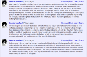 Not getting the hint, Bomberman came back under the name "Bombermanfan", a name that would typically require the advanced sock hunting skills of any given rogue admin on TOW. Fortunately, the McLeod community was able to detect the obvious sock by noticing he copypasta'd the same rants used to appeal his original ban, only altering them to be third person.