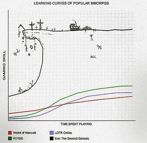 The creators of EVE Online thought the game would be easy to learn with the tutorials and help chats which they put into the game, (such as "Rookie Help" that is spamtastic). Instead, they fucked themselves over with these ideas. As you can see by this graph that is shown here, people have trouble getting over the learning curve of this game.