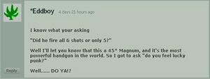 After deleting fucking everything and starting over, Eddboy's appetite for violence has increased infinitely. Where a normal person might simply feel annoyed at something or complain about it and then later forget about it, Eddboy draws pictures of himself murdering whatever it was that pissed him off. Keep trolling him, by all means. Maybe he'll get the next high score (unlikely, however; it's bad enough that he can't draw for shit and he's stupid as hell.) Be careful not to piss EddBoy off if he has a pencil in the vicinity, because it's possible he has UTHOR POWER and can draw people to make them die, a la Death Note.