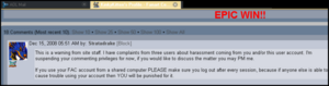 That plan drastically failed as well when two of the members notified the chief commander, Stratadrake, and informed him of KinkyFucktard's bullshit. He whipped out his secret weapon and suspended her account, thus resulting in the victory over evil for the FAC members.