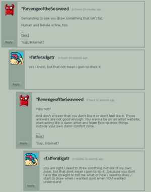 Fatferaligatr likes doing requests because he's too fucking stupid to think of any ideas of his own. However, he does not like to draw humans or anything of the female gender. He fucking can't draw them for he has never seen a naked woman in his life, like most fat people.