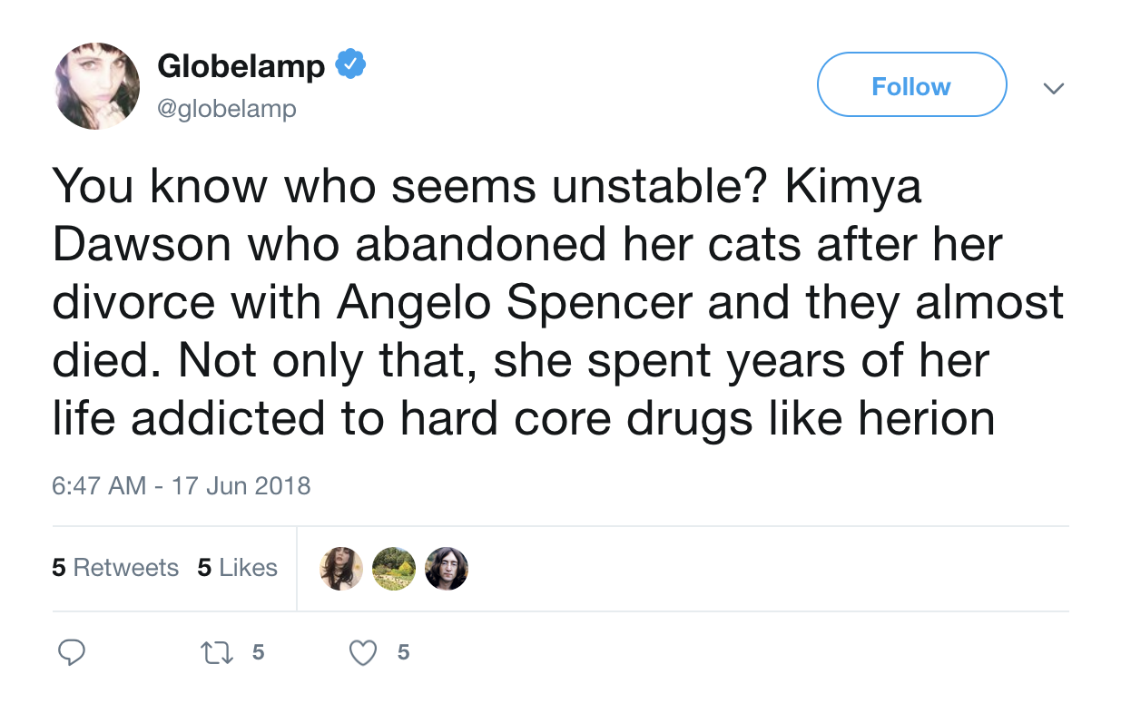 Lizzie spreading lies about Kimya. Note that a sock account liked this, as well as Sean.