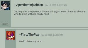 Recently, Flirty split up with her long-term boyfriend, Demonyero. It appears that Flirty cheated on Demonyero with some Emo guy. During this break-up, Flirty claimed to be pregnant, citing her 'constant puking' as evidence. Demonyero counters that his illicit relationship with Sonia-The-Hegdehog is to blame.