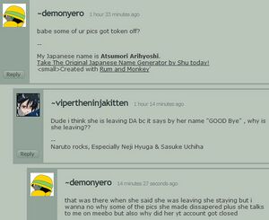 Further proof is her recent threat to leave DA. So far, she has returned numerous times to upload more sexy art and flounce. She has since admitted on her Youtube page that her sole reason for leaving DA was her lack of received comments.