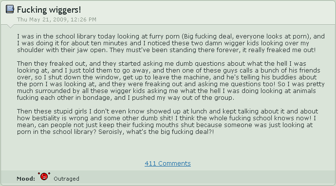 As the laws of physics would have it retards attract retards. Foxy's newest white knight has caused a world wide sensation of moar lulz. What seemed like a sockpuppet turned out to be a newfag, most likely an Azn using an online translator to get her message of righteousness across the interwebs. Despite the really bad spelling there was also a confusion as to what gender this person was. At first it was listed as female but now it's listed as male. Perhaps a tranny or someone suffering from Teruchan's identity crisis. Either way, the genderless tartlet posted a lulzy and very confusing journal which caught the attention of several people because of one phrase.