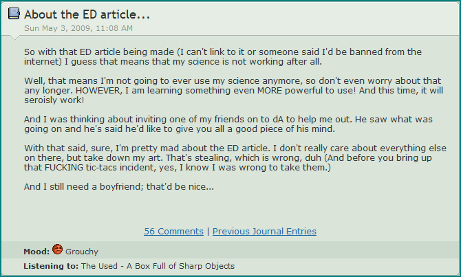 After the white knight journal was posted our little Foxy had made another journal this time putting up a note sent to her by an intelligent individual who knows how to properly web. This journal caused side wrenching lulz with a large order of intrigue and mystery.