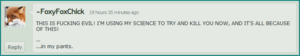 Shortly after her attention-whoring caused several people to flock to her page and leave comments full of logic and common sense she would retort with inane comments such as "No, your wrong" and the ever famous "I'll use my science on you!" Up until recently no one had any fucking clue what was this thing she called her science and if indeed it had any real effects. Just as we were about to give up hope of ever gaining knowledge of this science Foxy posted a very insightful journal explaining what her science is and how it works and why she's special enough to be able to use it.