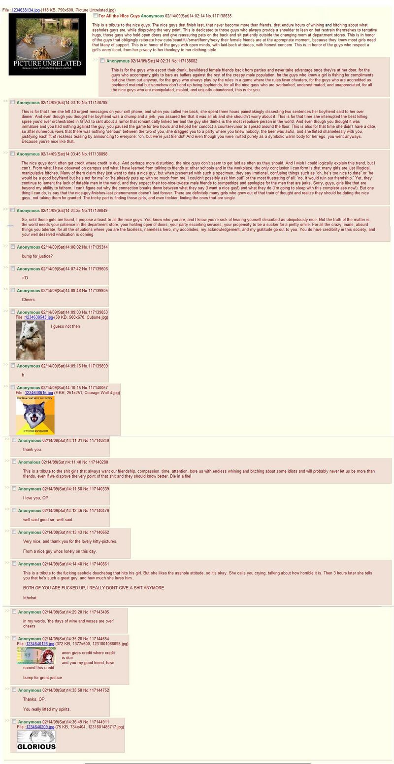 The friend zone is a soulless, God-forsaken hell-pit where lonely hearts go to die. It is one of the oldest and most common traps that women set up to trick gullible losers and neckbeards into an eternity of mental enslavement. The stage is set for the friend zone when the woman is already in a relationship with a real man, but in the times when the girl's man won't buy her those totally rad white Converse with Hello Kitty on the side, she will cry on Facebook about how she really wants them and would LOVE whoever would buy those shoes for her, thus you spend your money you were saving up for a PS3 Slim on the shoes for her hoping to get repaid with some teabag action or even just a quickie on the front lawn like a pair of dogs. Instead, all you get is "Oh thanks, I love you! You're so sweet!" Once those words are uttered you may as well jump into the Atlantic. Instead of singing hits from the 90's on SingStar or playing Marvel vs. Capcom 3, you now have nothing. As often as 13-year-old boys need to jerk off to Christina Hendricks or Quentin Tarantino, girls just have to bitch about something; therefore she tries to whine to her boyfriend. Being the insensitive bastard he is, the guy has better things to do than listening to her complains when he leaves the toilet seat up, and how he doesn't call enough, and other shit nobody cares about so he tells her to STFU. Of course, after a while of this she will start hemorrhaging angst and will desperately need an emotional tampon to soak it all up. This is when she will lure in a spineless nice guy for her to brutally shove into the bloody cesspool of emotional baggage known as the friend zone.