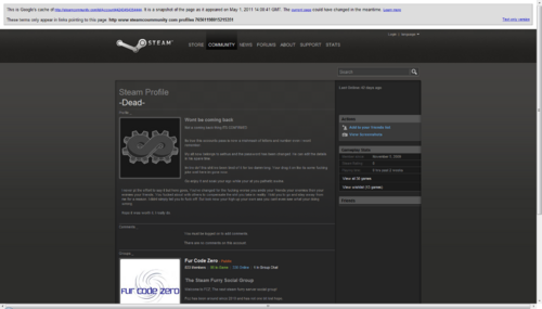 Quitting the Internet has been a monthly ritual for the box, He normally leaves the Internet forever when he gets the slightest insult on his steam profile page. He then proceeds to block everyone that he thinks would bash him and shuts his steam group "Fur Code Zero" down and puts it on Invite Only(As if anyone would want to join out of their own will anyway). He then boasts that he's had enough of drama and makes his steam profile private for a max of 6 - 7 days and trys to pretend like he's not online.