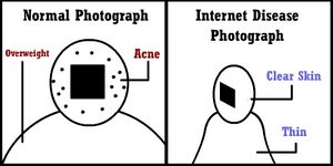 An internet diseased photo is taken with the subject standing at an angle, thereby hiding his or her obesity, bald spot, scars, etc. Also the contrast of the photo is increased dramatically in order to obscure unattractive facial features, like acne and the chin.
