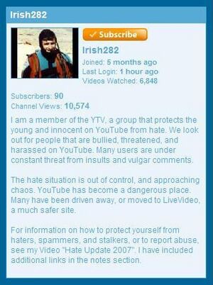 Irish282 (A.K.A. Claude Clark of San Jose, CA) is a fearless defender of YouTube from the godless raiders of Encyclopedia Dramatica. Our days are numbered, the Internet police will be breaking down our doors at any moment! Oddly, his obsession with defending children from the horrors of ED has led some to question his motives (link is now dead, user was suspended). Very little is known about Claude, except that, similar to shamed politician Mark Foley, he claims to work for the FBI; in doing so, he seems to have a lot of underage friends, and makes a considerable amount of accusations that everyone else is a child molester.