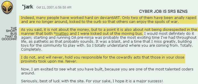 He and fellow CEO Spyed had two varying accounts of dA history after Spyed fired Jark's ass: Jark claims deviantART sprang forth as the result of his sole blood sweat and tears and that Spyed is a big liar, was only an associate at the time, and never worked on the site in the beginning (this despite the fact that, somehow, Spyed was appointed CEO and majority owner of deviantART inc., what is supposedly Jark's own project.) Spyed claims he was the one who procured the funds to keep the site alive when it first started. But this petty bitch fight isn't what we care about. What we care about is Jark's legendary behavior after his firing and the hilarious turmoil it stirred among the devianTARTlets.
