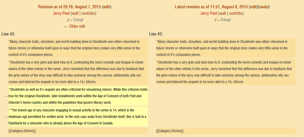 What Jerry failed to realize however was that checking a pages history is incredibly easy and leads to a user named "Alchorative", who not only edits pages about Peet exclusively, but also seems to know things about him that we don't. (In fact, Alchorative STILL seems to be active on TVTropes, still editing articles exclusively about Jerry and some of his friends.) Googling this name not only leads to an Okcupid profile of a 23 year old Nova Scotian man (who was last online just a day after Jerry's 23rd birthday), but also to a fanfiction account that not only was listed as being the same age Jerry was in 2011 and having the exact same interests he has, but also wrote one fanfiction only: a 9 year old being raped by her adoptive mother.