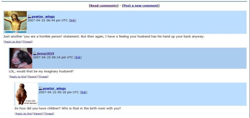 Jessy1019’s claim to internet fame is being FOR abortion but AGAINST adoption. Her philosophy can be summed up by saying, "I can breed, but no one else can." In 2007, she caused a shitstorm on LJ that makes CF_Hardcore look rational and moderate.