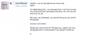 During the /b/raid, a few private albums of Heather Blough, who was revealed to be the personal account of pornstarMellissa Midwest, containing several nude pictures of her were made public, which made her brother rather angry. In a private message he let's her know that she is no longer welcome to join the family on Thanksgiving. This too was posted on /b/ and articles.