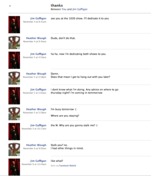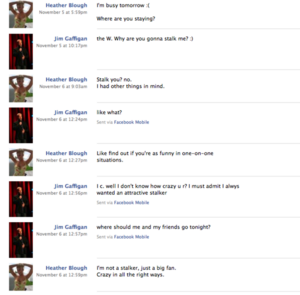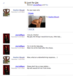 Jim Gaffigan is a famous comedian who frequently appears on Comedy Central. He got pwned by /b/ when /b/tardshacked into Heather Blough's Facebook account and dug up some embarrassing private messages they've sent each other. Screen captures of the exchange were posted on /b/ and sent to internet celebrity news sites and a few articles were published, giving full credit to /b/ for the hack.