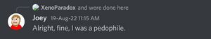 On June 15th, 2022, to the absolute surprise of absolutely fucking nobody, it had been revealed to the general public that Joey had been exposed as a pedophile. Reason being that in the Friday Night Fucking community Pisscord server, Friday Night Moddin', he sent a really questionable message. The message from Joey was an image of Whyatt (who's fucking 10 years old) but shirtless and really built with a six-pack, the caption to said message is "Here's proof Super Why is sexy." Everyone in the server being reasonably blindsided by that, he was banned on the spot. He even sent that same image with the exact same caption in GoAnimate City, a popular GoAnimate community Pisscord server where all the GoSpergs go to worship their favorite GoAnimators. Which (unsurprisingly) got him banned there, too. When he got banned from both servers, he dead ass tried fucking suicide baiting moderators from both servers to unban him but since that shit never fucking works on the internets, he just fucked off before he annoyed the poor moderators who were unfortunate enough to bare witness to this absolute pedophilic ween's nonsense any further.