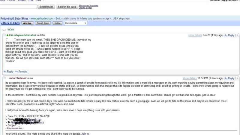There is now also a lovely email screencap, allegedly of him proposing major felonious shit (crossing state lines in order to sodomize a minor etc.) and incidentally revealing his full name, no doubt resulting in a very personalized extension of the continuing raid to include telling his wife, colleagues and friends (if he has any).