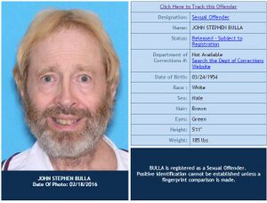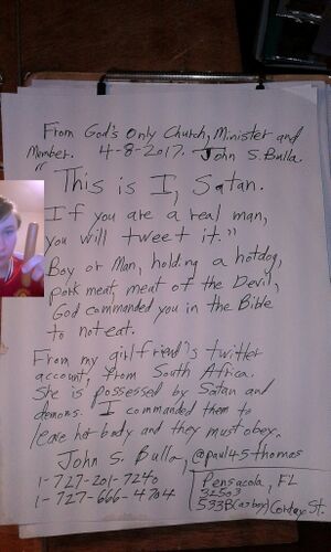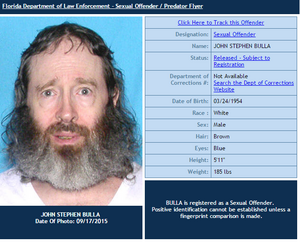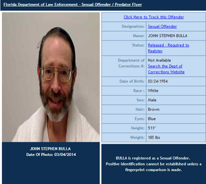 John Steven Bulla is a 63 year old retard diagnosed paranoid schizophrenic who believes he is the only ordained minister of God. More commonly known as the "most florida man". He claims to have the "holy priesthood", which allows him to cure major diseases such as AIDS and cancer, wake beautiful women from the dead, and kill demons. People on the internet have often taken advantage of this and toyed with his gullible nature, playing the roles of what he has made up in his mind (demons, beautiful women, sea sponges). Additionally, John Bulla is a registered sex offender with a lengthy history of verbal, sexual, and physical violence. He has served over 10 years in prison & over that in mental institutions, with a fluctuating temperament.