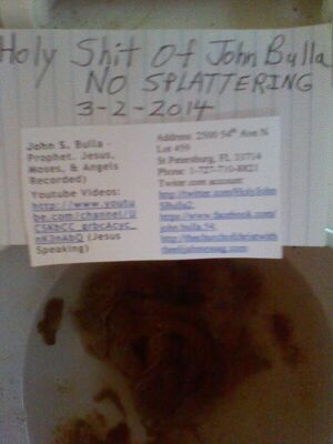 3/2/2014 - Even though he was very drunk the night before and said he would never drink again, without anyone telling him, John who recently received his food stamps for the month, went to the store and bought an 18 pack of Pab's Blue Ribbon beer and 3 bottles of wine. John currently has a beer or two every night and is living life to the fullest now that he became aware that drinking was not a sin. That day the Virgin Mary contacted John and convinced him to take pictures of his shit, and post them on social media sites to prove to the demons that his shit was not "splatters" like the demons were saying they were. John followed through with this and posted pictures to Twitter and Facebook as per Mary's request. (see John, Poop, and his child-like antics )