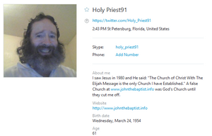 In his younger years, John was called by his middle name "Stephen" or "Steve". He suffered minor abuse and outing by his father, who in later years he claims to have "caused the death of his father by praying to God and wiping the dust off of his feet off at him." John graduated from high school and went on to receive an (obviously very outdated) degree in computers. During so, he has admitted to doing a lot of drugs (specifically hallucinogens such as LSD) which are thought to have progressed the onset of his schizophrenia. During this time, his brother Art Bulla introduced him to Mormonism in which he became very fond of and later became an elder. However, he soon discovered The Church of Christ with the Elijah Message and became very close with one of the elders, John. After John passed away, it appears that John Bulla got in a dispute with some of the other members and left. He now claims that he is the only ordained minister of the church. This means he is the only person that can allow marriage, divorce, etc. He is the only person who can baptize you into his "church" (which, currently, has not yet been built and includes no legitimate members).