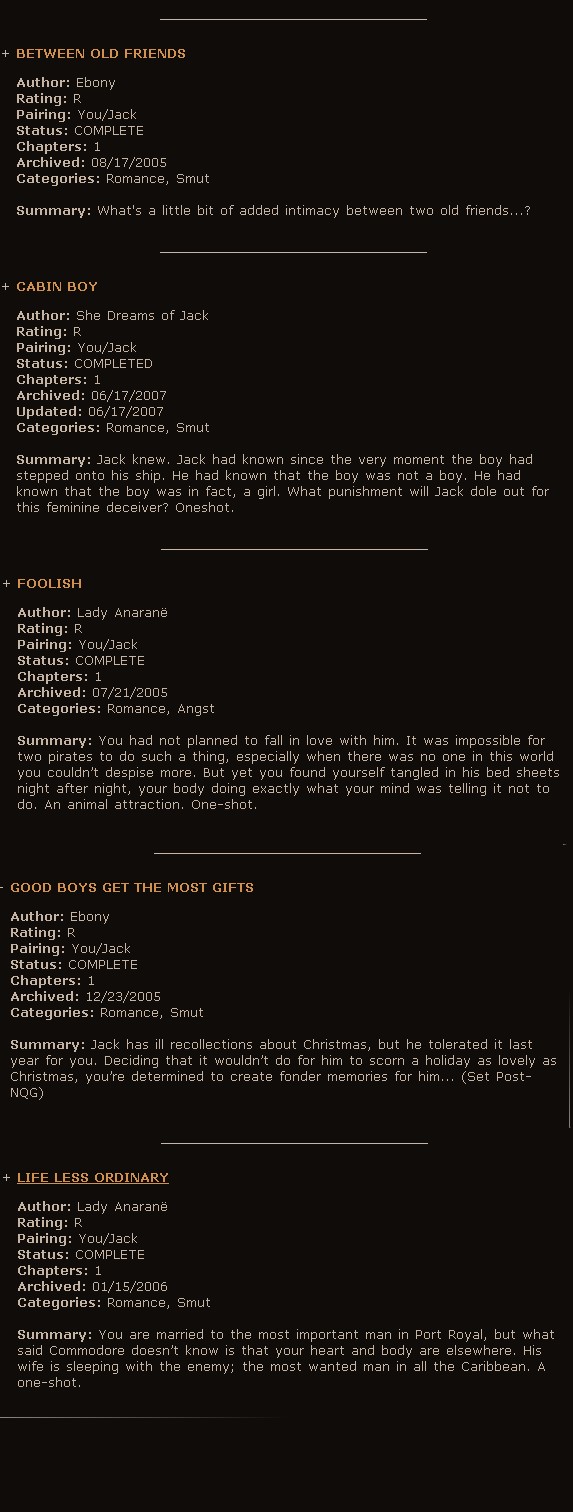 Johnny Depp beats even Final Fantasy VII and Inu-Yasha for the disturbingly high number of fanfics written by teen girls where they write themselves in and fuck whatever character he for about 80% of the damned thing. The character is almost always Jack Sparrow, though cutters seem to like writing about Edward Sissorhand's cock. Here's how to write a typical Johnny Depp movie fanfic: