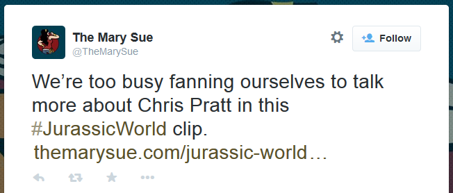 A logical person would have probably pointed out the irony/hypocrisy in a site that constantly whines about objectification tweeting about them all fingering themselves at the sight of a shirtless Chris Pratt. But not a beta like Joss. No, Joss instead chose to complain that they are overlooking the misogyny of the Jurassic World trailer, the true victim of which (according to Whedon) is Pratt's fully clothed co-star.