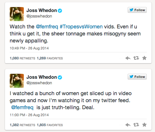 Hilariously, Thunderf00t (doing something not retarded for the first time in his life) made this video to show what Anita would think of Whedon's videos if she didn't need him for publicity or he didn't need her as a meat shield against other feminists: