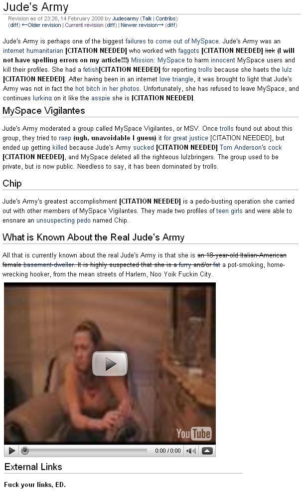 Aside from being a butthurt emo/indie Jewish Wop grammar nazi with OCD and Asperger's (all of the above are true, btw), Jude's Army is perhaps one of the biggest failures to come out of MySpace. Jude's Army was an internet humanitarian who worked with faggots liek Mission: MySpace to harm innocent MySpace users and kill their profiles. She had a fetish for reporting trolls because she haets the lulz. After having been in an internet love quadrangle which almost caused one dude to become an hero, it was brought to light that Jude's Army was not in fact the hot bitch in her photos. Unfortunately, she has refused to leave MySpace, and continues lurking on it like the basement-dweller she is.