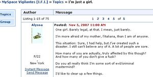 Jude's Army moderated a group called MySpace Vigilantes, or MSV. Once trolls found out about this group, they tried to raep it for great justice, but ended up getting killed because Jude's Army sucked Tom Anderson's cock, and MySpace deleted all the righteous lulzbringers. The group used to be private, but is now public. Needless to say, it has been dominated by trolls. Jude's Army has recently logged in, though she has not done anything, and the group sits there, abandoned.