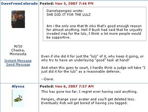 Jude's Army's internet humanitarianism pwns Danielspengies. That message was to a MySpace employee, btw.