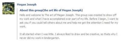 Meg spends her time on Facebook playing Farmville and other wholesome activities such as Gay Bashing. She can be found here and here letting everyone know she's straight and proud. But she's not hating on people, it's "just her opinion LOL". Like every other aspie fucktard on the planet, it's only her opinion that counts and anyone who disagrees is a troll. She has a new failbook group dedicated to her art. She's attempting to sell her wretched abortions for $5-$15 a piece. In typical Meg fashion, she's begging for moar publicity. Let's all help her out.