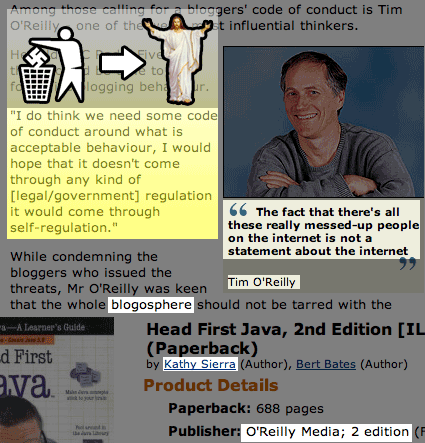 In this BBC article, Tim O'Reilly, the Al Gore of Web 2.0 and Sierra's publisher came to the podium, calling for a blogger code of conduct. In other words, he intends to encourage blogging websites to crack down on free speech. Perhaps it would be a bit more convincing if he wasn't sleeping on bags of gold and preferred stock in his publishing company. One could consider he is a kingpin in a cabal with Kathy Sierra to create an anti-troll street team comprised of zealous bloggers and fanboy vigilante fags. A system of power where they are the executive and judiciary, and ruthlessly crush anyone who doesn't follow O'Reilly scripture. In the meantime, O'Reilly can go publish 1984, and since times change, they will have an excuse for you to buy another edition every year. More recently, this clown has jumped in for a piece of the speech-control action.