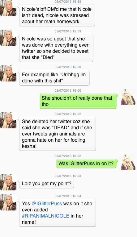 Ke$ha, Nicole is alive -.- the girl who started #RipAnimalNicole said so. and so did her friend in real. I can't belive this...