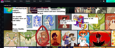 Kyah Peterson used to be a great person, and she used to change a lot. Even from her downhill start around the mid-2010s, the complicated history is that she has problems finding a boyfriend and the ruined friendship with Conkeronine, which they forgive each other and remain as friends to this day for stealing Conkeronine's design and ideas, especially the infamous OCs that used to be "Killer Ann." It was known that Kyah had disrespected and slandered Conkeronine OCs and ripped his dick, giving him cancer, and died. It is a typical thing that a betraying friend does, as for "backstabbing" (to this day she is known fully today and currently that she is backstabbing people, whoever she befriends).