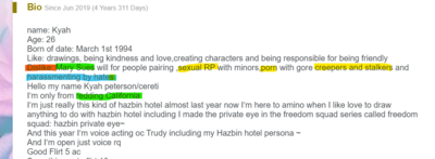 She is somewhere in California state, living with the family, despite California being a wasteland of rich people and people who are in the movie business, yet Kyah is probably looking for her dream job to become a real public figure outside of online; her dream is to become a talent artist or creator. She is too obsessive about "Helluva Boss" and Hazbin Hotel, which people are into of that shit. Thus, she is not very healthy, going after minors or underage people, asking her to be their friend and take control of them to brainwash them and support Kyah. She loves minors (little kids) to go to sleep with Kyah, which is absolutely disgusting as fuck.