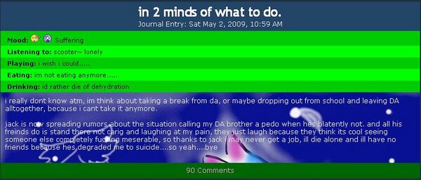 From this journal alone you can tell just how BAT SHIT INSANE this girl actually is, moar liek how BAT SHIT INSANE she claims to be for the sake of her friends attention amirite?. Of course all the things she denies in the journal are in fact true, she was in close relationship with the man she now calls her brother (a twenty-six year old angry-faggot-collector from Louisiana; bringing the age difference to twelve years - what a whopper; that's what she said)!