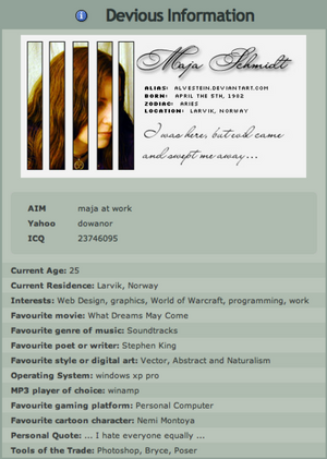 alvestein or dowanor, or Zoey – born Mai Schmidt on 5 April, 1982 – is an angry Norwegian Internets drama queen, big mouth, blogger, spam poster and troll, who is currently residing in Larvik, Norway. Since she's the only Maja Schmidt living in Norway, it would be wise to tarnish her reputable name.