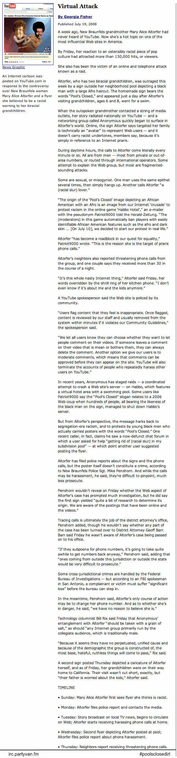The original raid took place as Anon's crusade against racism, sparked by a little black American boy who was denied access to his local pool because he was apparently HIV positive. Hence the "Pool's Closed due to AIDS" phrase. Little does Mary know that she is hindering anon in helping remember this great injustice. In fact, she cries racism instead.