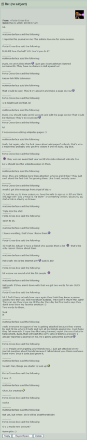 Very shortly after this article's creation, the word was spread to Matt and he reacted promptly with a journal. Like a usual Internet tough guy, he claimed he didn't care about the page yet spent time writing a journal on it and also wants to bring ED to court (but will get nowhere) Matt, with his fixation on the two paraphilias, regarded the sysops of ED to be obsessed with bestiality and pedophilia.