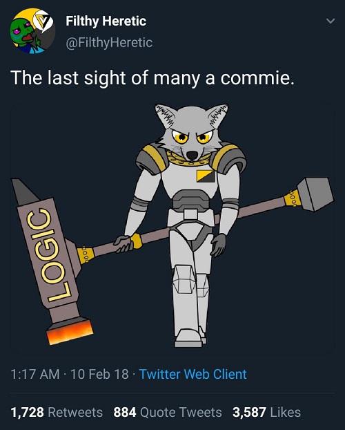 In 2018 in the midst of them soliciting CP to own the libs, is morbidly obese scalie boyfriend posted this gem on Twitter thinking that it was epic and the commies would cower in terror. It ended up being the laughing stock of Twitter and to this day it still gets parodies and reposts because it's pure fucking cringe. It was one of the reasons Filthy quit Twitter but at least he left it there for all of us to behold. It was so embarrassing to Eso he changed his name to "Eso the Free" to avoid more ridicule.
