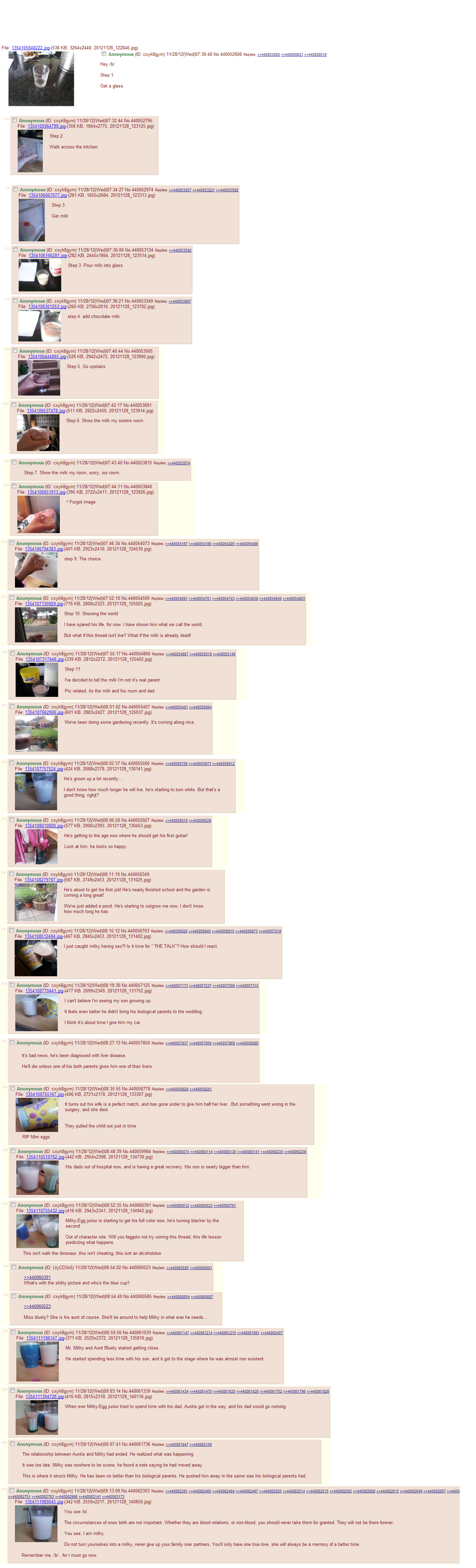 On November 28th 2012, a post with an attached picture of an empty glass made feels felt across 4chan. OP first stated the obvious by telling 4chan how to make chocolate milk which turned into an almighty tale and spew of feels.