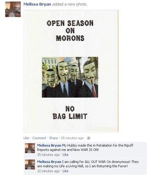 Missy stalks and harasses people. She is fond of accusing others of all kinds of stupid shit, even things they had nothing to do with. Mostly this is to cover up the complete failure of her own affairs, partly because she has a revenge fetish, also because she can’t figure out what the fuck the Internet, Anon or trolling really is. She has dragged people into IRL LEGAL ACTION OMGZ court requiring them to “clear their names” of her insane accusations. Needless to say the lulz generated by such stupidity more than made up for it.