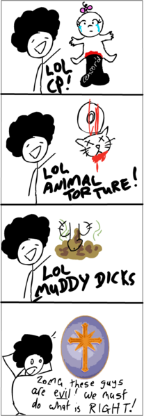 Moralfags believe that the internet is serious business. They also believe that they are making shit difference in the world by prancing in front of Scientology with Guy Fawkes masks and Longcat signs without doing it for the lulz. Moralfags can sometimes be found in pedophile and serial killer imageboards telling everyone that they are sick fucks (which they are) not because salting the earth is fun, but because they legitimately care if children get raeped and if hookers die from something other than AIDS. A good example of a moralfag is Mark Bunker, who temporarily turned Anonymous into a nest of fail.