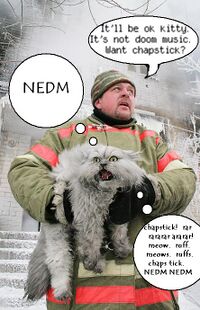 NEDM, an acronym for Not Even Doom Music. It was a meme born from the darkest bowels of YTMND as reaction to serious business. Shortly after its creation it was promptly smeared all over the Internet like anything that appeals to a young white demographic. It is considered to be the much anticipated sequel to Zippocat and as such it's fantastic, like any sequel. NEDM is the source of much Internet drama and hate from those who can't appreciate art from YTMND because killing cats is not funny ever. If you think any differently then fuck you, you insensitive fuck, just FUCK YOU. If you vote anything other than one at any point in time then it is obviously clear that you enjoy burning cats and wish to destroy the American dream.