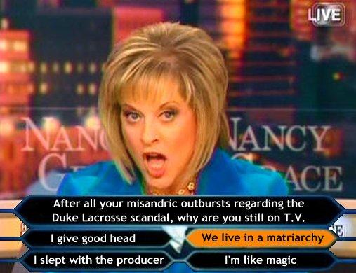 THIS TV PERSONALITY KNOWS DRAMA! NANCY'S PRESUMED RAPISTS AT THE DUKE LACROSSE TEAM WERE FOUND INNOCENT AND NANCY MADE AN INTERVIEWEE COMMIT SUICIDE! |