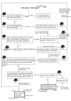It's not me that's the problem. Women are just too stupid to realize that there are nice guys like me out there who care for them. They're also so evil that they'll use up the emotion and care we devote to them, only to knock us back because they don't see us as boyfriend material, or because they don't realize that we, in fact, LIKE her like her. Worse, I've read some feminists on the internet say that nice guys like me are really misogynists, and that if I in fact cared for women and girls like Bitch, I wouldn't be pretending to be nice and acting like an asshole. What do those bitches know? I'm a nice guy, no matter what any of them say! Those women are just trying to justify their sluttish ways! "Sexual agency"? "Sexism"? "Misogyny"? What the fuck are they talking about?