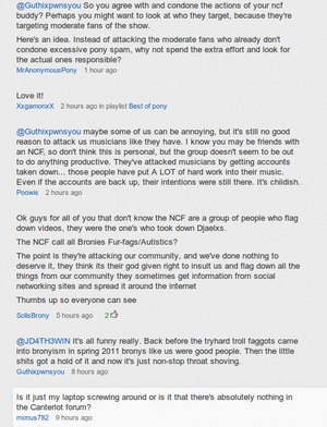 Gaining notoriety brought out those who, for whatever reason disapproved of the NCF, and thus began several cute "take down campaigns". One such coming from Celtic "I honestly don't care" Brony who, despite claims, cared enough to inform Google that, "They're reporting videos to troll and are trying to close peoples accounts to be trolls. They already got my main account and I tried filing a counter claim against the false copy right but the staff are too stupid to see that it's just trolls being idiots", and additionally, "The YouTube Staff should do something about these guys but I doubt anything will happen".