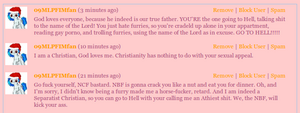 The arrogance of YouTube users has long been one of the driving forces of the NCF. Thanks to Google and their user-friendly DMCA forms, the NCF has been extraordinarily successful in ridding YouTube of infidels such as CelticBrony and