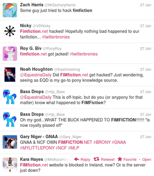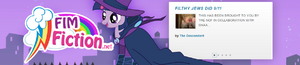 FiMFiction.net is the largest database of MLP fanfiction on the net, which by default made it a target for NCF cleansing. Causally entering and taking delicious cookies from the not-so-good-with-computer site owner, NCF/GNAA agents were able to briefly promote their core messages, most notably, awareness of JEWS DID WTC.